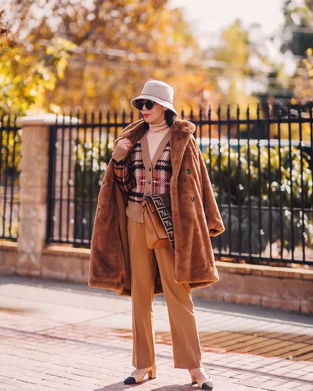 深驼色的皮毛夹克外套,手上挎一个驼色的椭圆形包包,瞬间看起来多了几分可爱的气质。