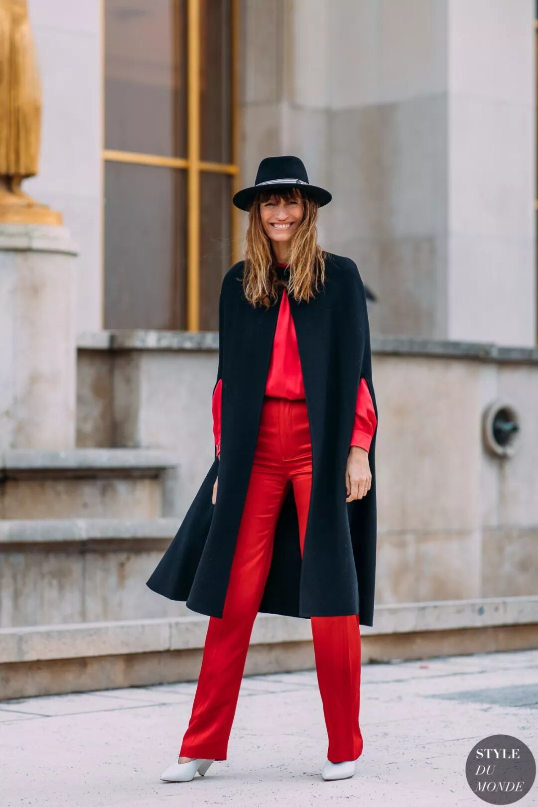 如果不喜欢全身都是黑色的沉闷,也可以只让裤子和鞋子保持一致的颜色,上半身可以选择轻盈的色系搭配。