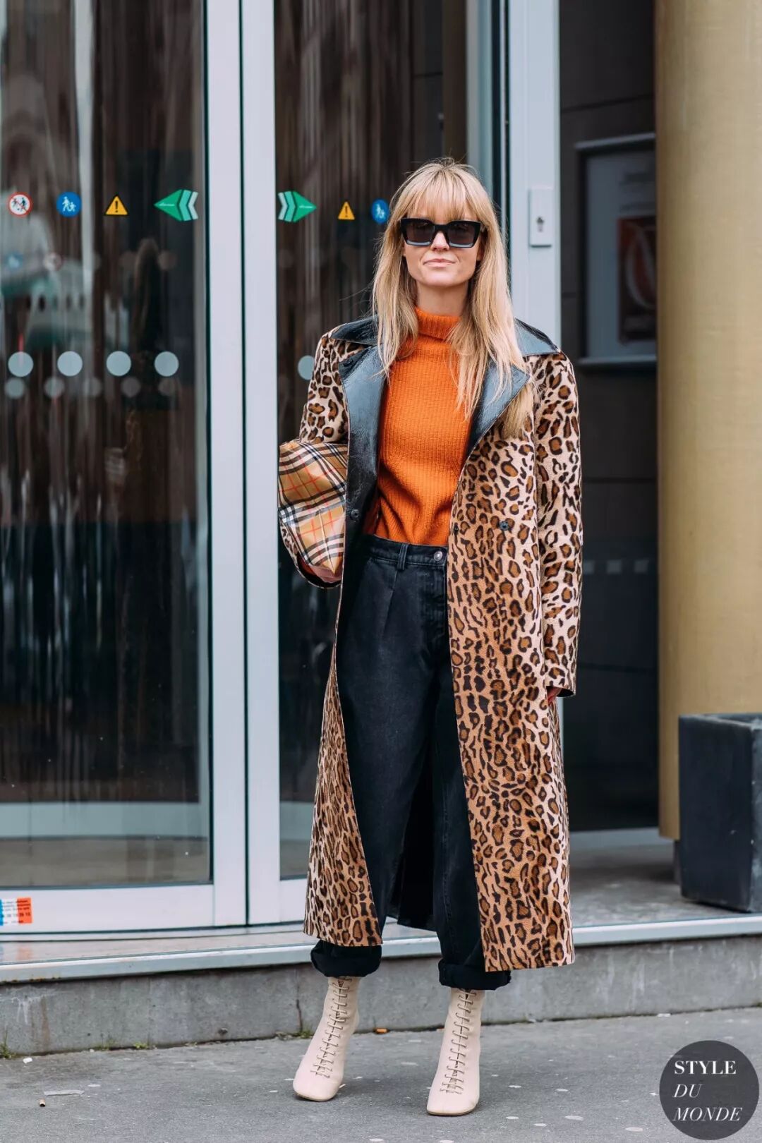 单一颜色高级质感的毛衣也可以搭配同色印花外套,例如橘黄色的豹纹风衣组合橘红色小高领,这样穿显得十分帅气潇洒。