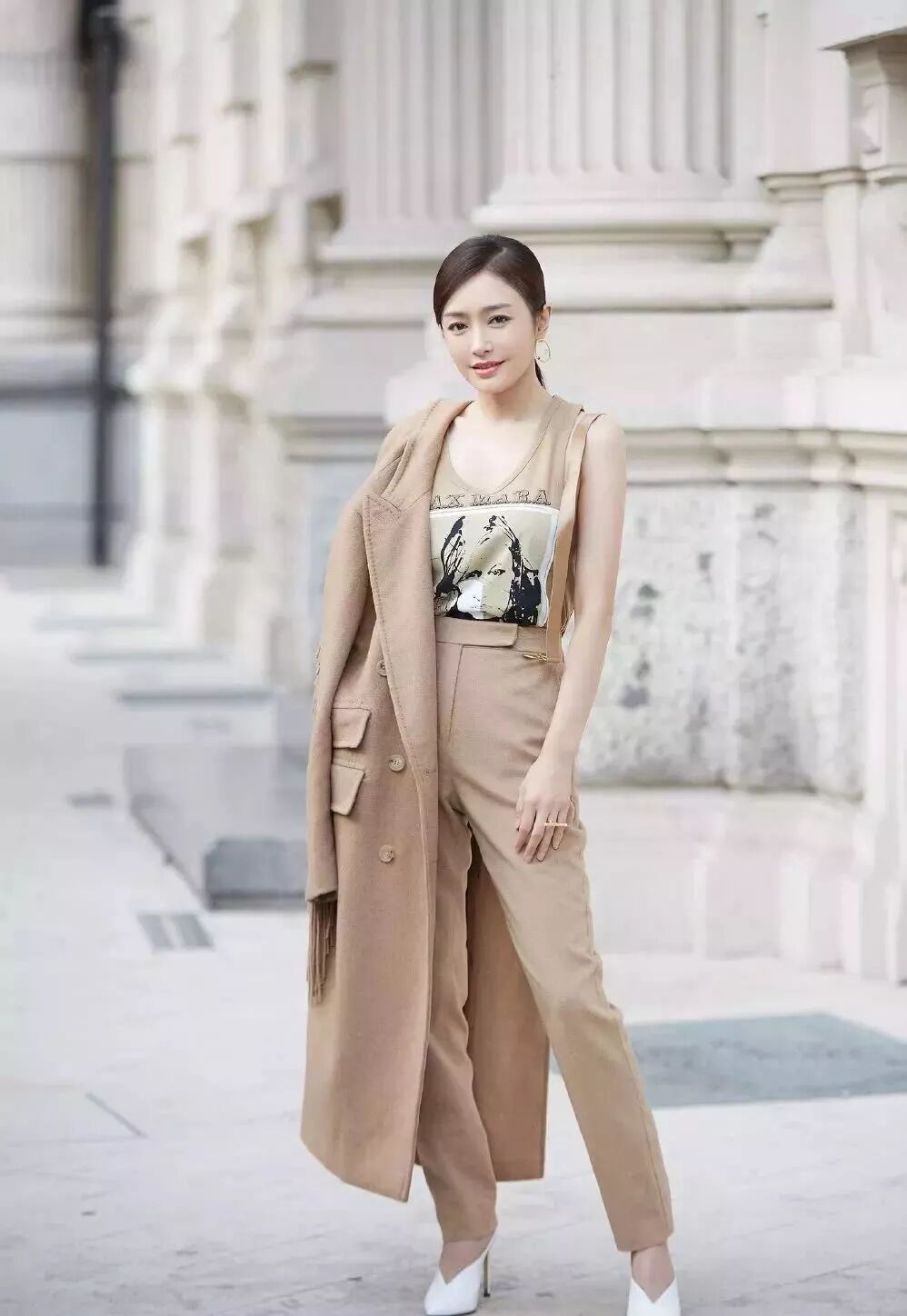 人像印花圆领背心搭配同色大衣,活泼的印花作为大面积穿搭的点缀缓解单调,强化穿搭趣味。