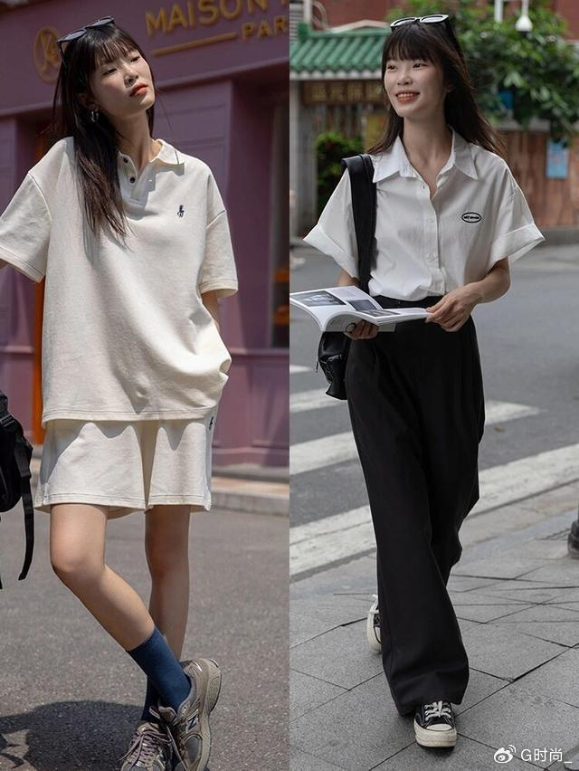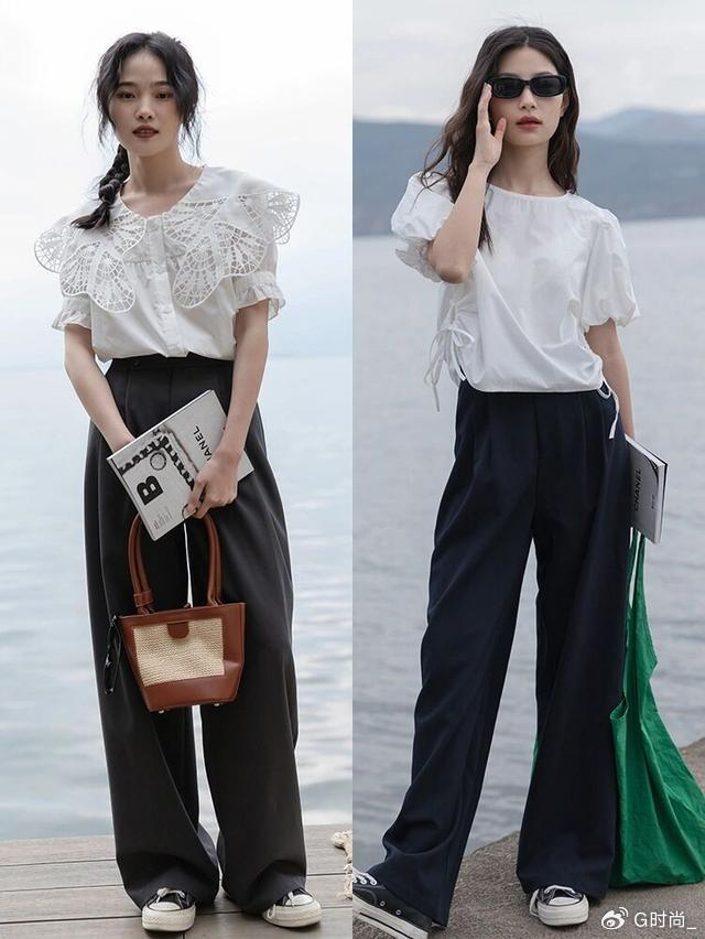 像这种一身白的穿搭也很时髦,或者是白衬衫配上黑色的裤子,简单中又不乏时尚感,普通人都可以hold住。