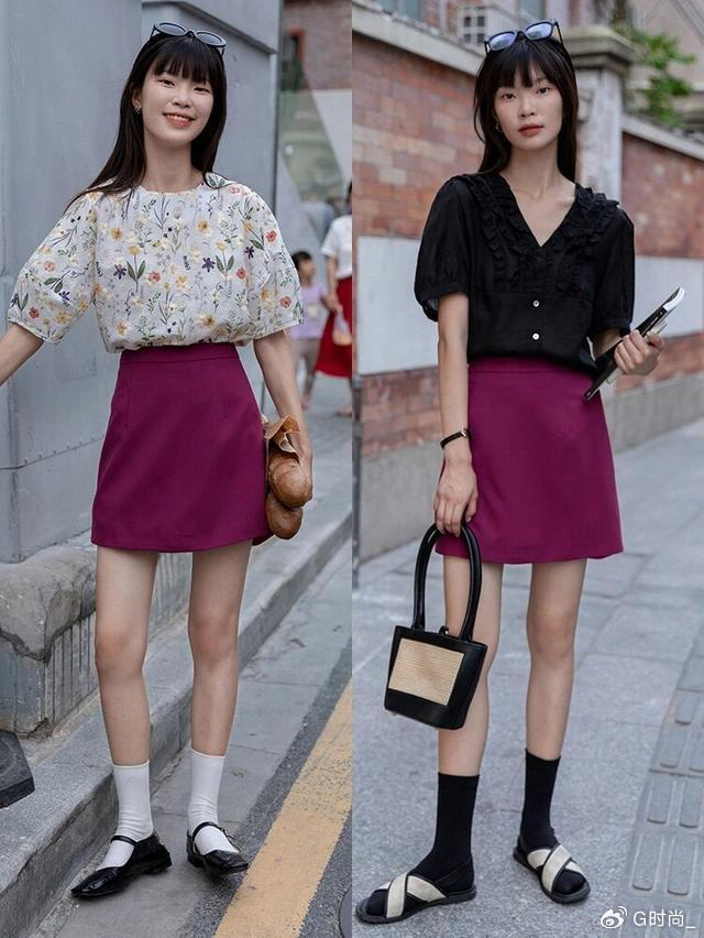 而且还能够通过露腿的搭配降低造型的沉闷,看上去更清爽。这种彩色裙装的搭配还是蛮个性的,配上各种黑白色上衣,简单又低调,并不会觉得繁杂。