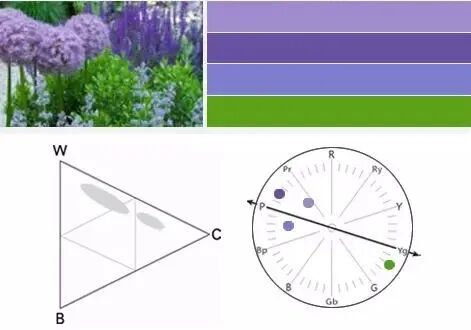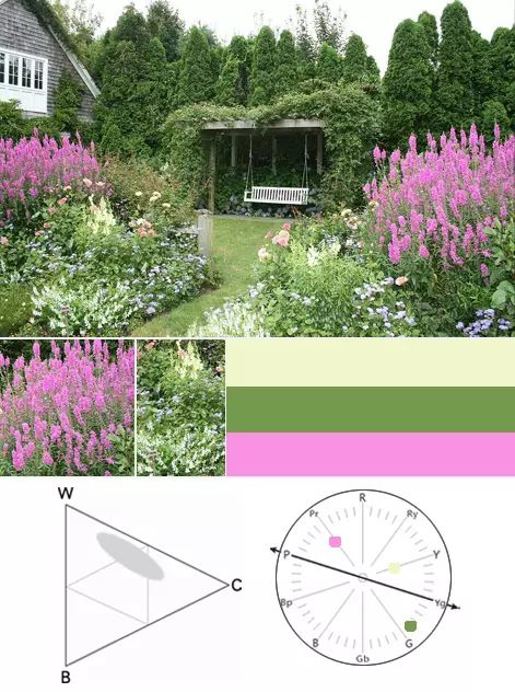 淡紫色、淡黄色、与绿色植物搭配,色域范围为中高明度。如红千蕨菜和绿植搭配,能形成自然、雅致的氛围,适用于公园和生活庭院空间。