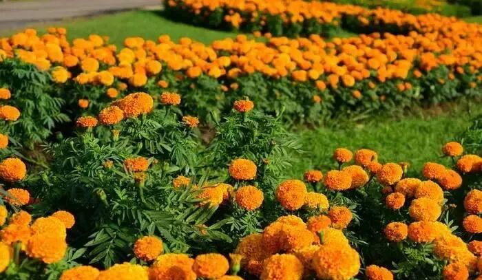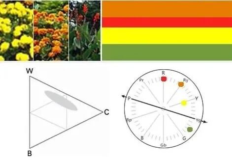 黄色与橙色、红色植物的搭配,色域范围为中高明高彩度。如菊花与美人蕉,在空间上拉开层次,形成奔放、热烈的氛围,适用于主行道两旁或娱乐园区。