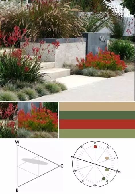 灰绿色、米黄色与红色植物的搭配,色域范围为中明度中彩度。如红花萱草与草类植被高矮配植,能形成愉悦、轻松弛缓的氛围,适用于休闲公园和庭院空间。