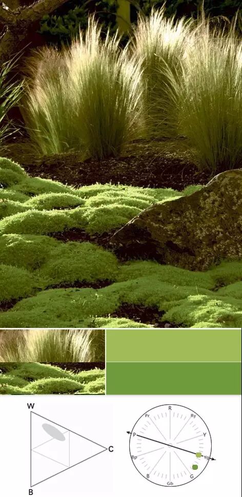 黄绿色同色系植物搭配,色域范围为中高明度。如细叶针茅与苔藓类草被植物的搭配,色彩接近,能形成清新自然、闲适洒脱的氛围,适用于休闲绿地空间。