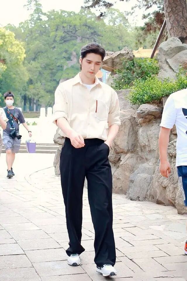 当衣服非常有设计感时,同样不能忽略的还有发型和单品的搭配,像阿云嘎他穿了一件很有复古风味的衬衫,搭配微长的头发和一顶鸭舌帽,再加一个太阳镜,整个人看起来就非常时尚,下身就要选择不盖过上身特点的单品,比如说一条黑色的阔腿裤,简简单单就足够了。