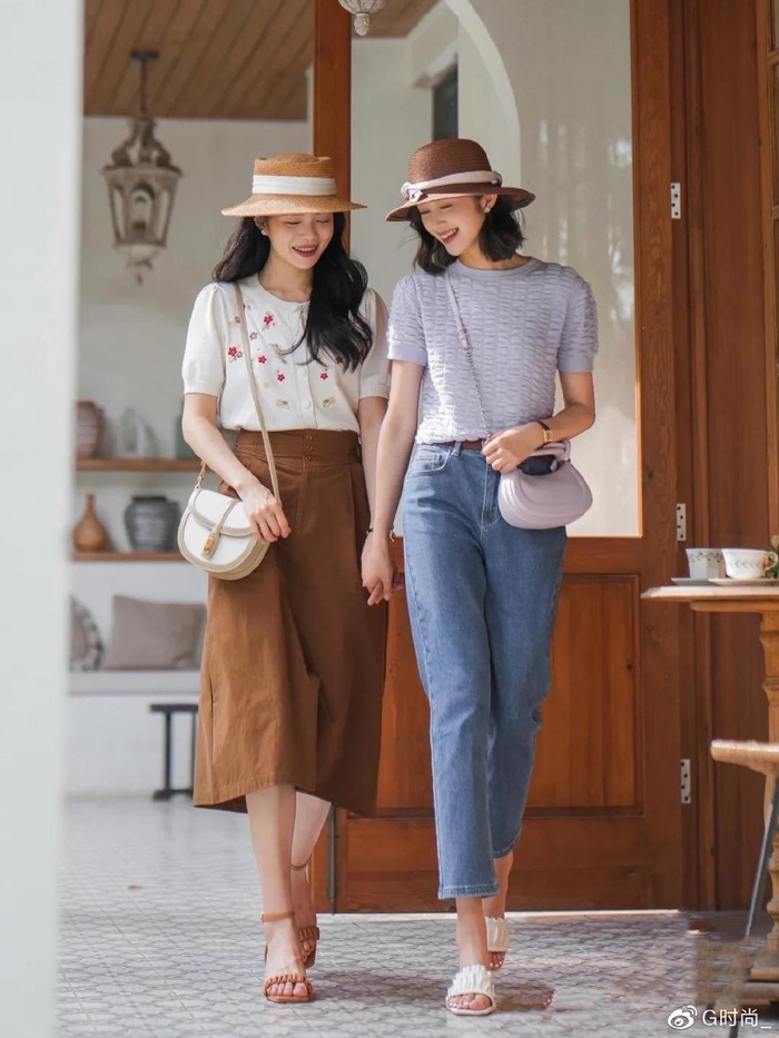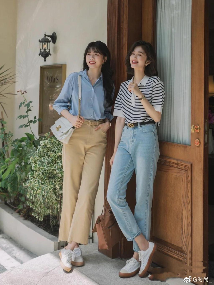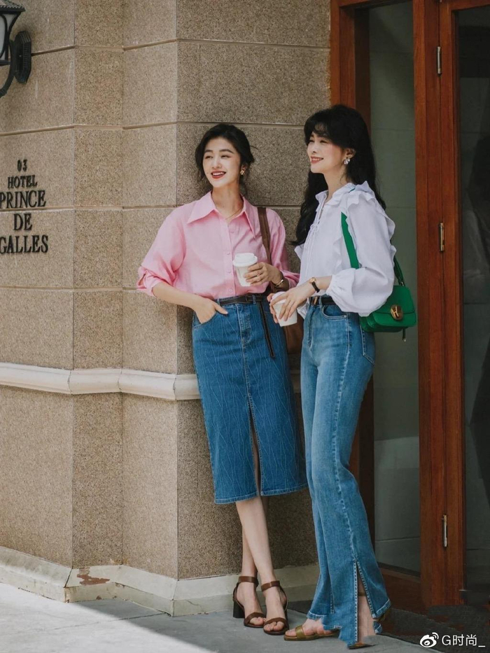 常规的基础款衬衫,不仅可以酷飒吸睛,还可以自然地玩转复古风穿搭。谁说蓝色牛仔半身裙不适合搭配,配上粉色衬衫真的是清新又惹眼呀。这样的配色清爽又高级,完全没有稚嫩感。