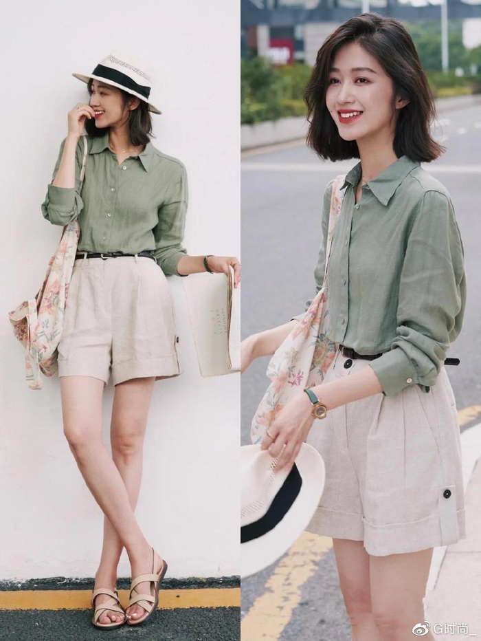 这样的基础款衬衫,本就可以凭色彩取胜。但搭配上却更加出彩,同样面料的高腰直筒短裤,让整体风格更加协调,视觉上更加酷飒。有一种轻柔又帅气的美感,配绑带凉鞋更显气质。