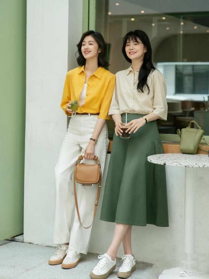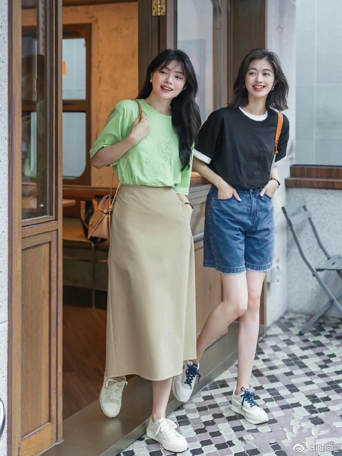 其实清爽的绿色T恤,是一种特别惹眼的颜色。这种亮度相对较高的色彩,更加适合冷白皮来穿着。配上卡其色的半身裙,也是一种高级又清爽的撞色。