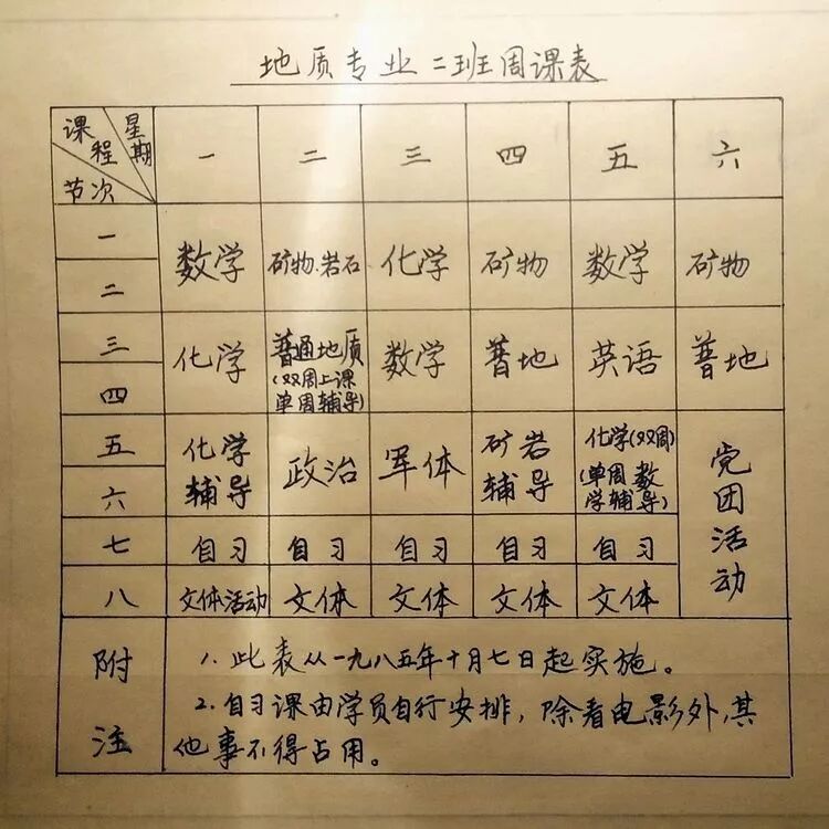 下午上课。课堂是个旧车库。墙上挂块黑板,前面摆张桌子,教员在前面讲,学员们席地垫草而坐,膝盖当桌子,边听边记。指导老师讲解了这次实习的目的、任务和方法;实习区的概况和地质演变历史等。带队领导讲了实习期间的作息时间、管理规定和实习中的安全注意事项。