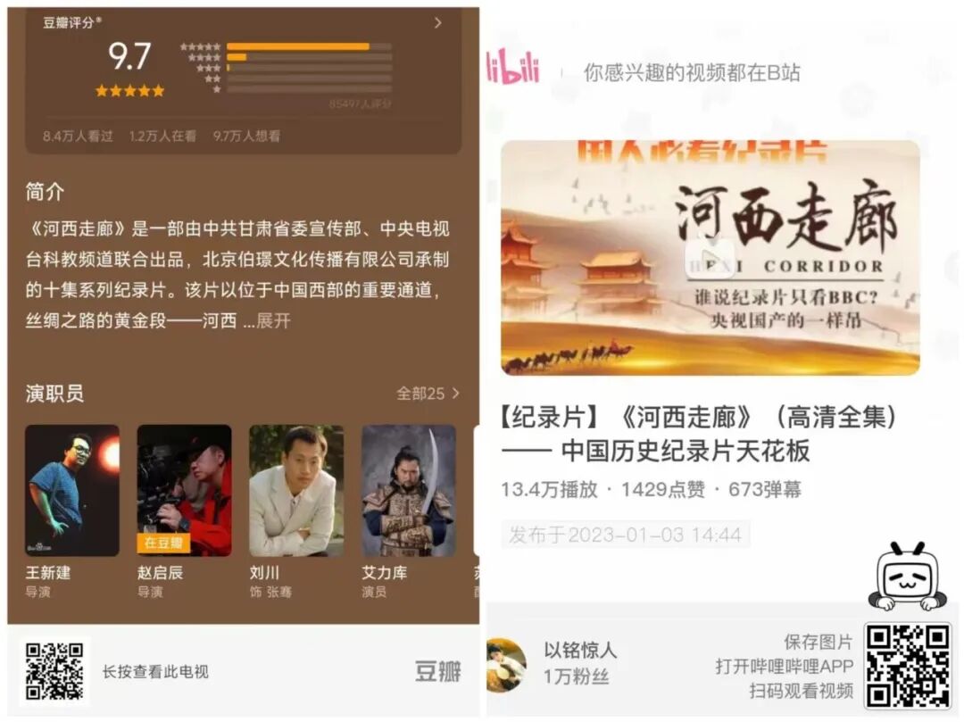 再给大家推荐一部去西北前一定要看的纪录片,是 2015 年在「一带一路」国家战略大背景下推出的《河西走廊》,一共10集,每集 45 分钟,目前豆瓣评分 9.7
