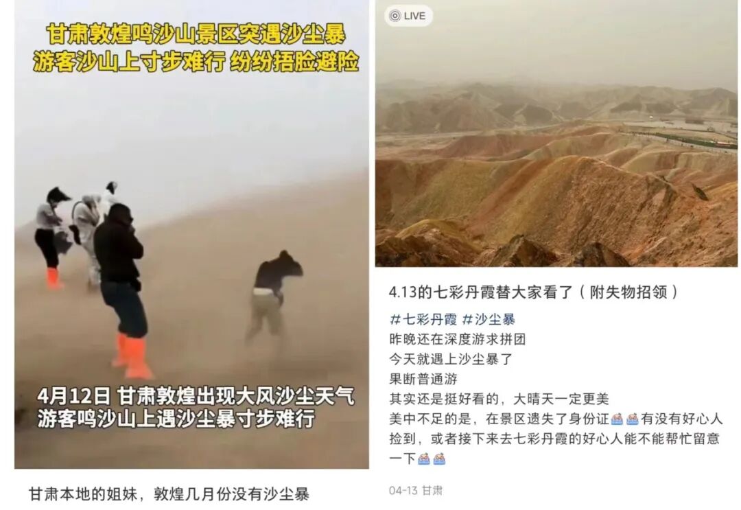 同样的,春天的甘肃沙尘暴肆虐。我是4.11玩的鸣沙山,4.12去的张掖七彩丹霞。转过头来就在小🍠上刷到 4.12 鸣沙山沙尘暴,4.13 七彩丹霞沙尘暴😱