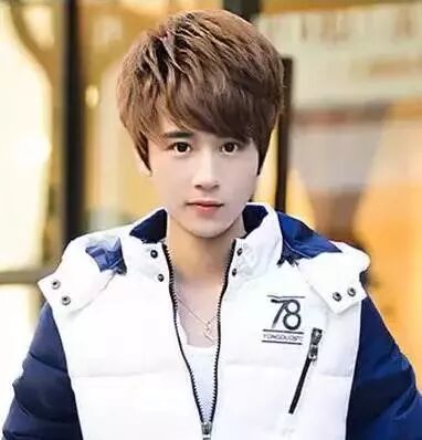 再利用的是清新低调的乌黑发色,而内扣形式的齐刘海发型设计与微烫形式的短发造型,最显男生的呆萌学院风了。