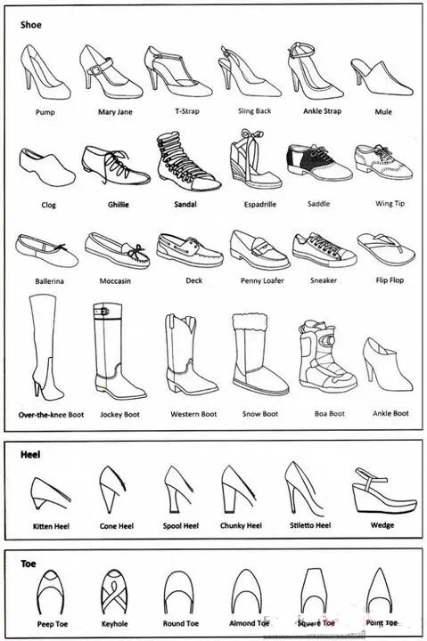 下面的鞋子种类都是一些基本款。女士最基本的是Pump,各年龄段女士都可以穿着,Mary Jane比较适合年龄大一些稍微保守一些的女士。而T-Strap丁字鞋比较适合脚型好看的年轻女士。 Sling Back也是时尚女士的必穿鞋种之一。今年比较流行Sandal 角斗士凉鞋,个子高的女士也可以穿没跟的Ballerina平底鞋,这需要一定的气场才能穿的出来。男士来说Saddle, Wing Tip都是比较经典的皮鞋款式,比较适合30岁以上商业人士穿着。 Deck或者是Loafer比较适合休闲时候穿着,主意穿这两款鞋千万不要穿袜子。Sneaker和Flip Flop男女均可,都是比较休闲和年轻化的受众的选择。除此之外,女性的高筒靴,UGG雪鞋,Ankle boot高筒鞋都是很经典的款式。而Jockey boot, Western boot比较适合潮人男士穿着。