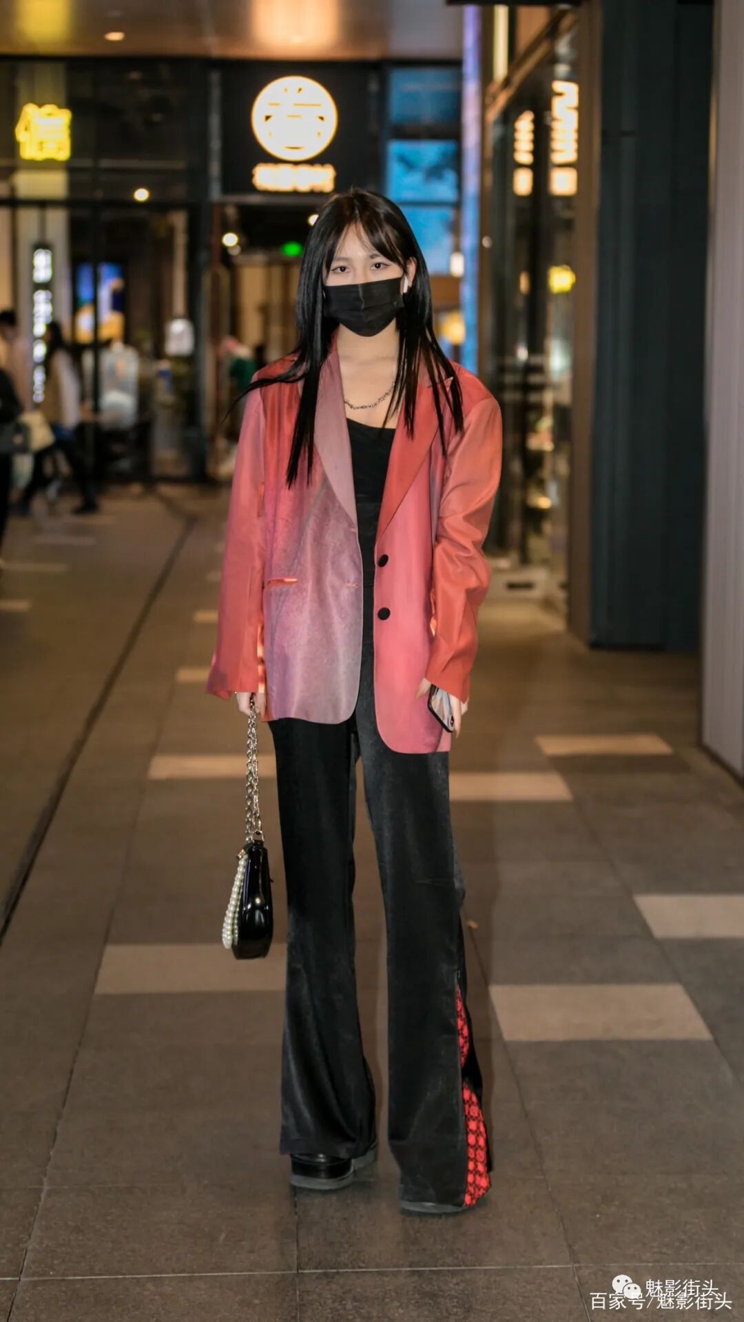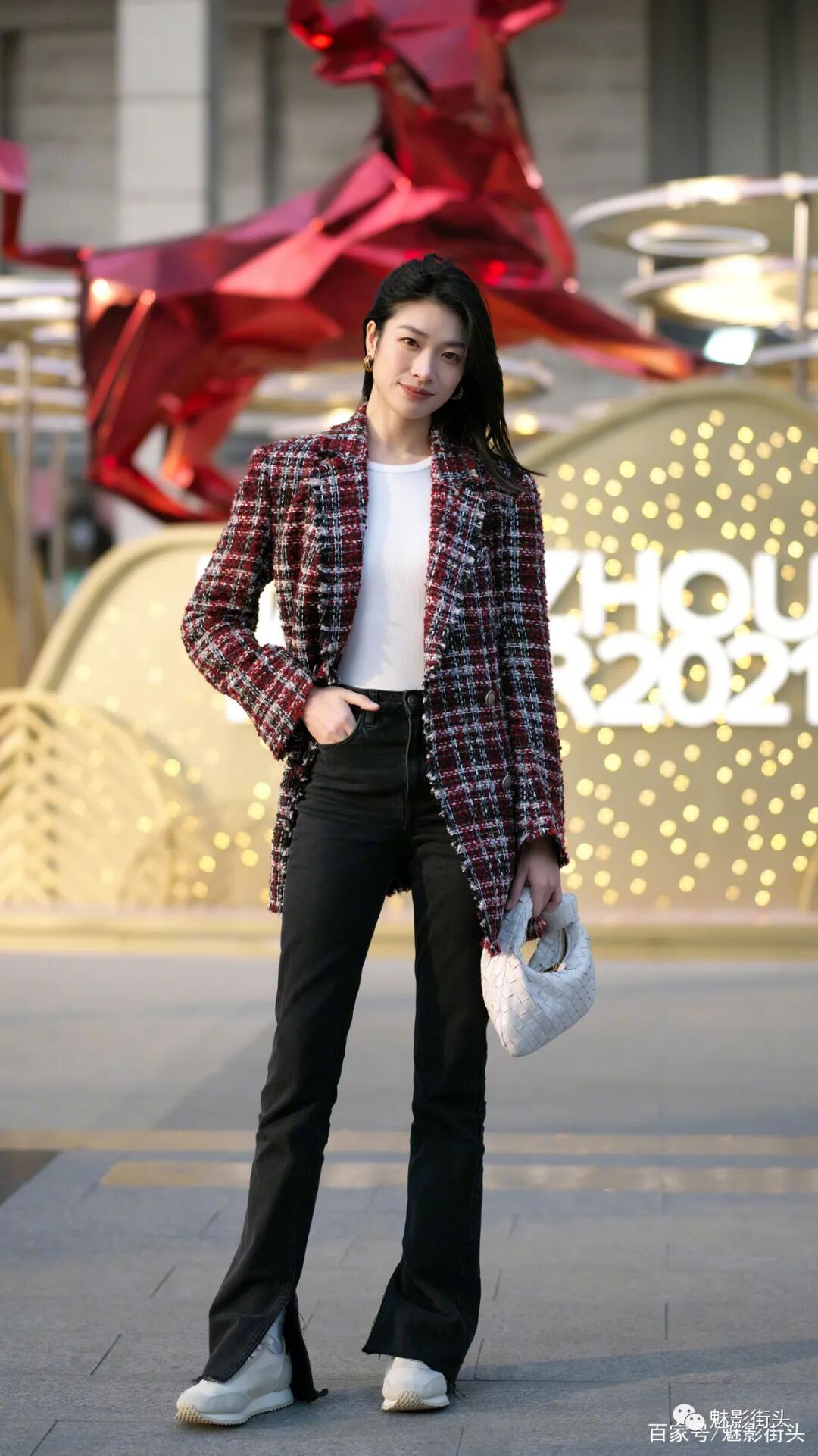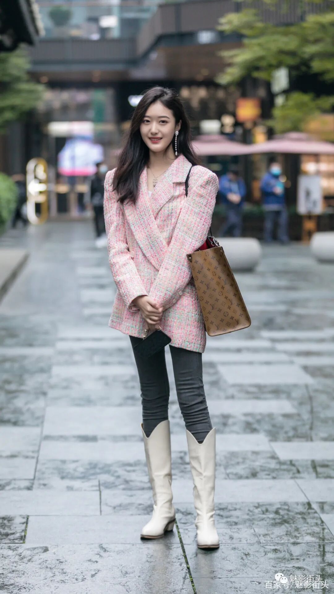 身高腿长的姑娘裤子就更好选择了,强烈建议选择紧身牛仔裤,可以让双腿线条显得更加流畅,颜色以黑色最好,也更容易搭配。再配上一双白色长靴,就能轻松获得双倍保暖的效果,白色与黑色形成极大的反差,可以提升紧身牛仔裤显腿长的视觉效果。西装可以考虑粉色粗花呢面料,与白色长靴上下辉映,减龄效果非常好。