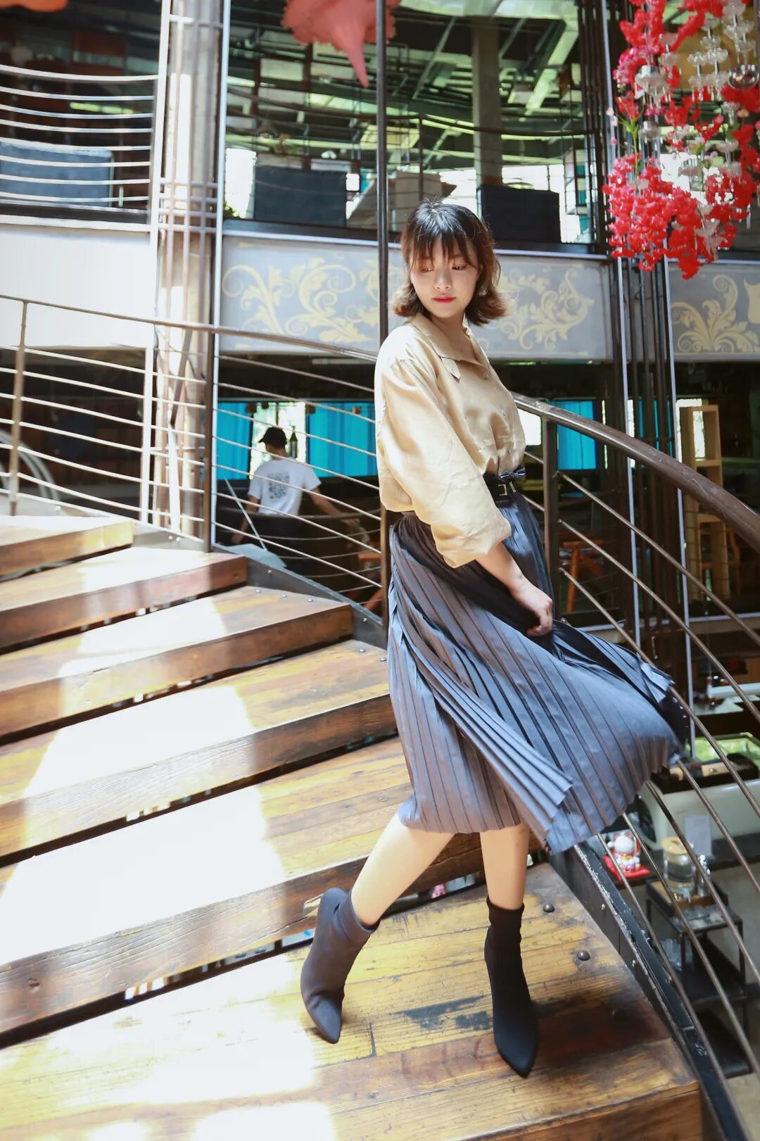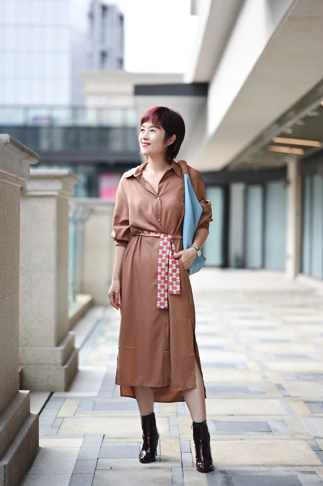 用暖色的衬衫搭配灰色压褶半裙,配色很秋天。