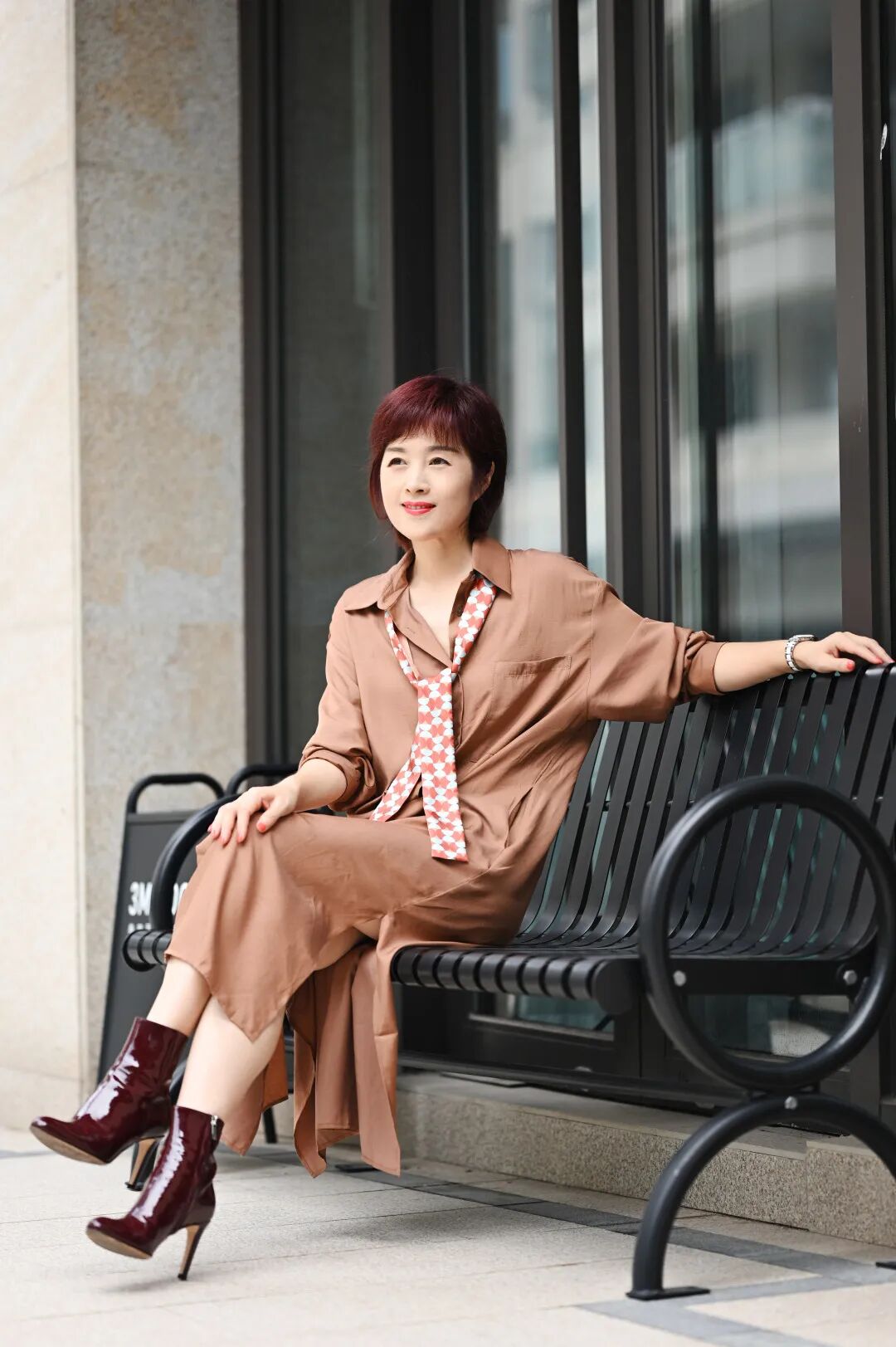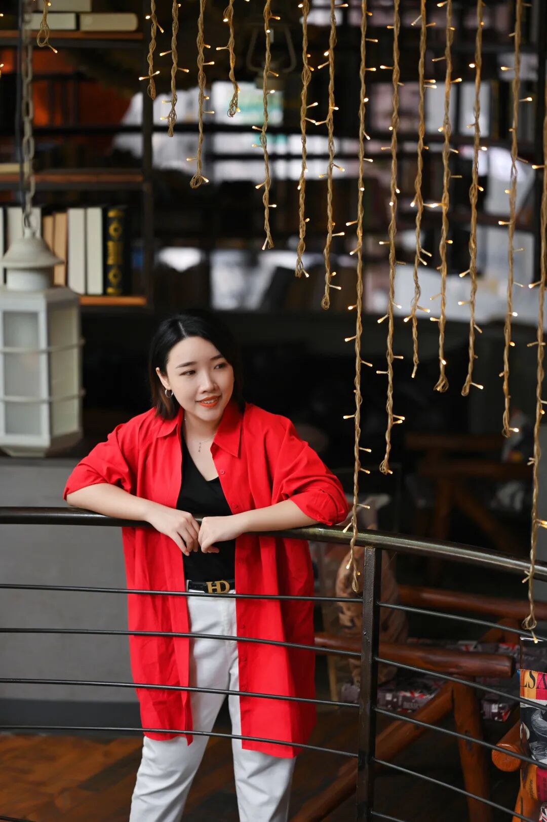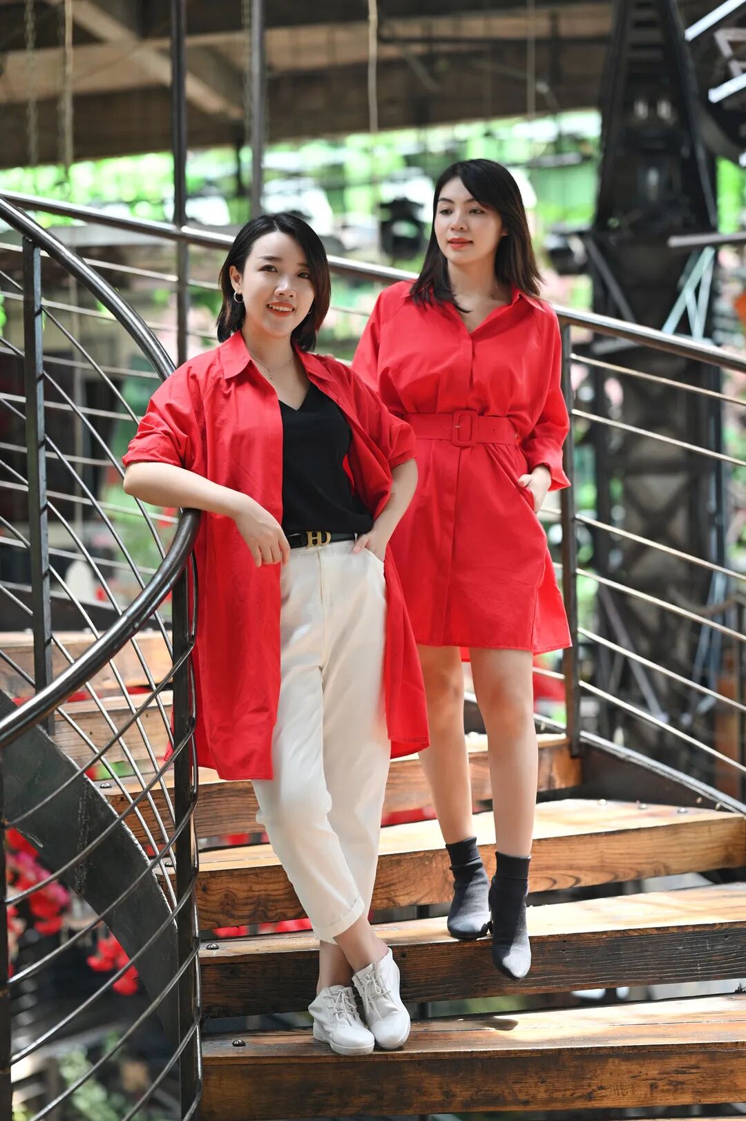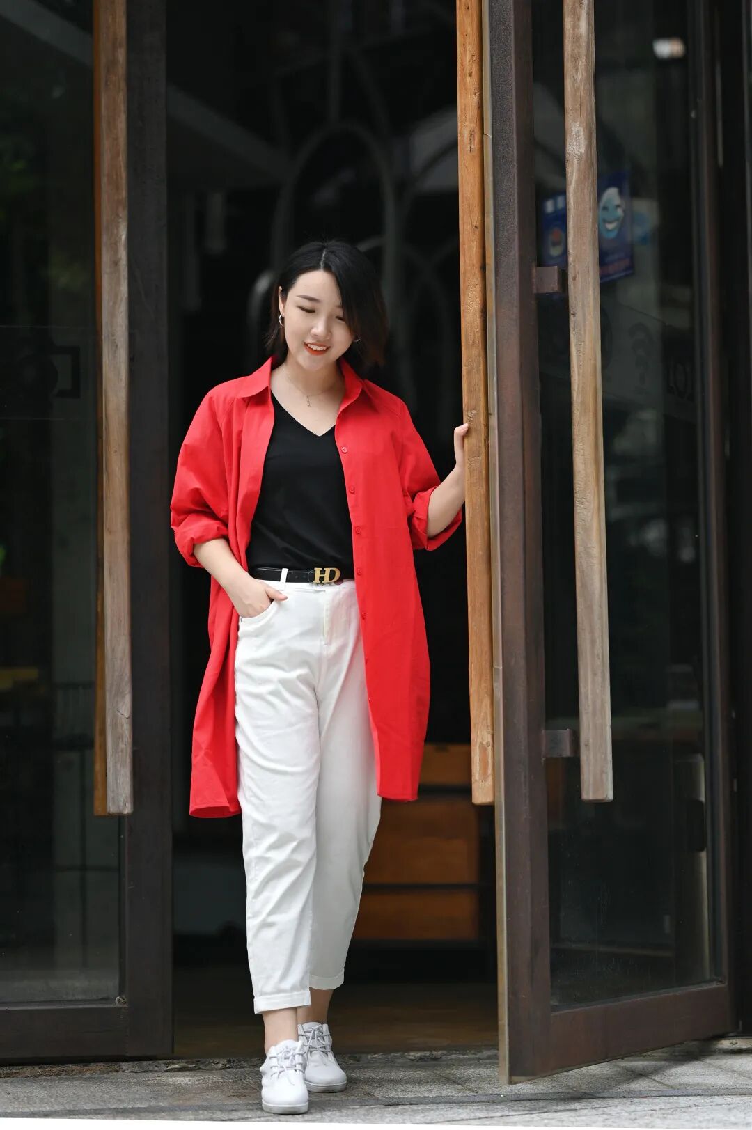 一件棉质感的红色长衬衫,面料轻薄挺括,内搭黑T+白色牛仔裤,色彩的层次过渡得自然,而外套的视觉冲击力是这套搭配最大的亮点。