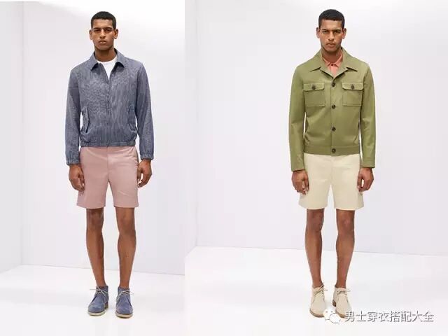 短裤配西装外套以商务人士来说或许略显高调唐突,改以短夹克外套搭配沙漠靴,以亮色搭配点缀,让整体造型更轻松,周五上班或是周末半正式的活动场合,充满新鲜感的穿法,让人眼睛为之一亮。