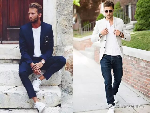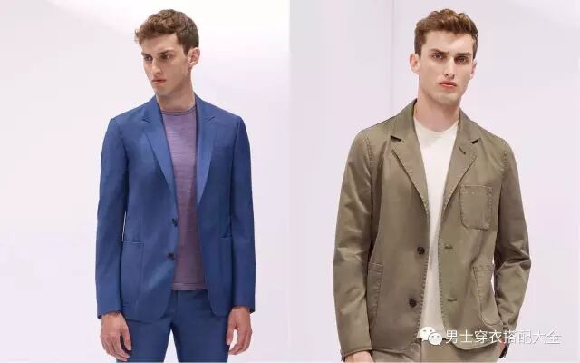 把衬衫换掉的穿法虽然简单,但一不小心就可能过度休闲,要随著场合改变搭配单品的方式。较正式的场合,西装外套与裤款成套搭配,若是轻松的场合,下身可换成丹宁裤或卡其裤。
