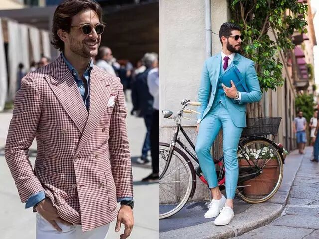 Pitti Uomo 的孔雀式穿法虽然出众,但似乎有点过于高调,型男在绅装造型中加入色彩时,可挑选饱合度较低的设计,并搭配中性色调,如海军蓝、灰、卡其等,或是使用跳色手法,选择一两样单品跳色搭配,整体造型亮眼却不浮夸。