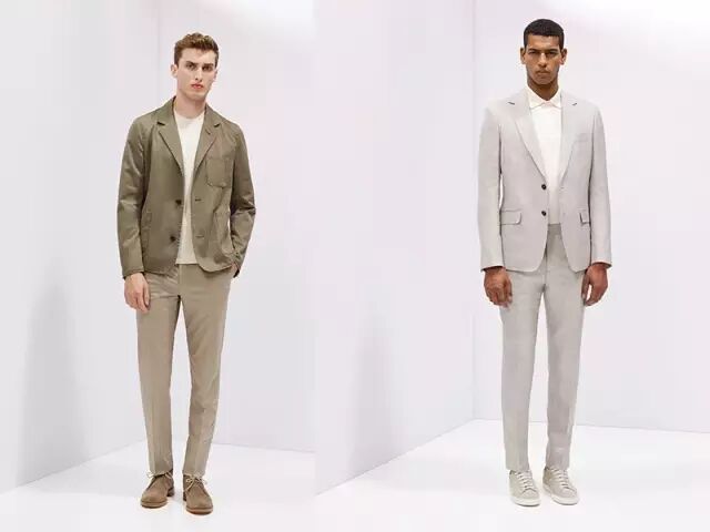 这两季特别流行全身同色系的穿搭,春夏推荐浅卡其亚麻成套西装,下身选择九分贴身剪裁的西装裤,搭上简单白色帆布鞋,除了能营造纯粹简约、干净俐落的形象之外,也能拉长身形比例,更显高挑帅气。