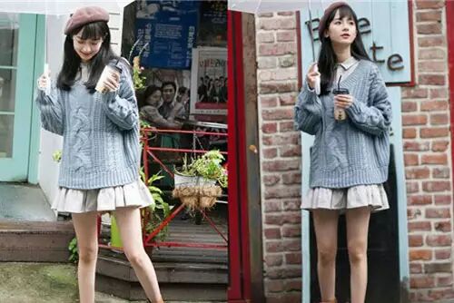 宽松款的毛衣可是超级显瘦藏肉的哦!搭配一条初春迷人的短百褶裙,可爱又不会让你的粗腰凸显出来,棕色的马丁靴又让造型加入了几分个性。