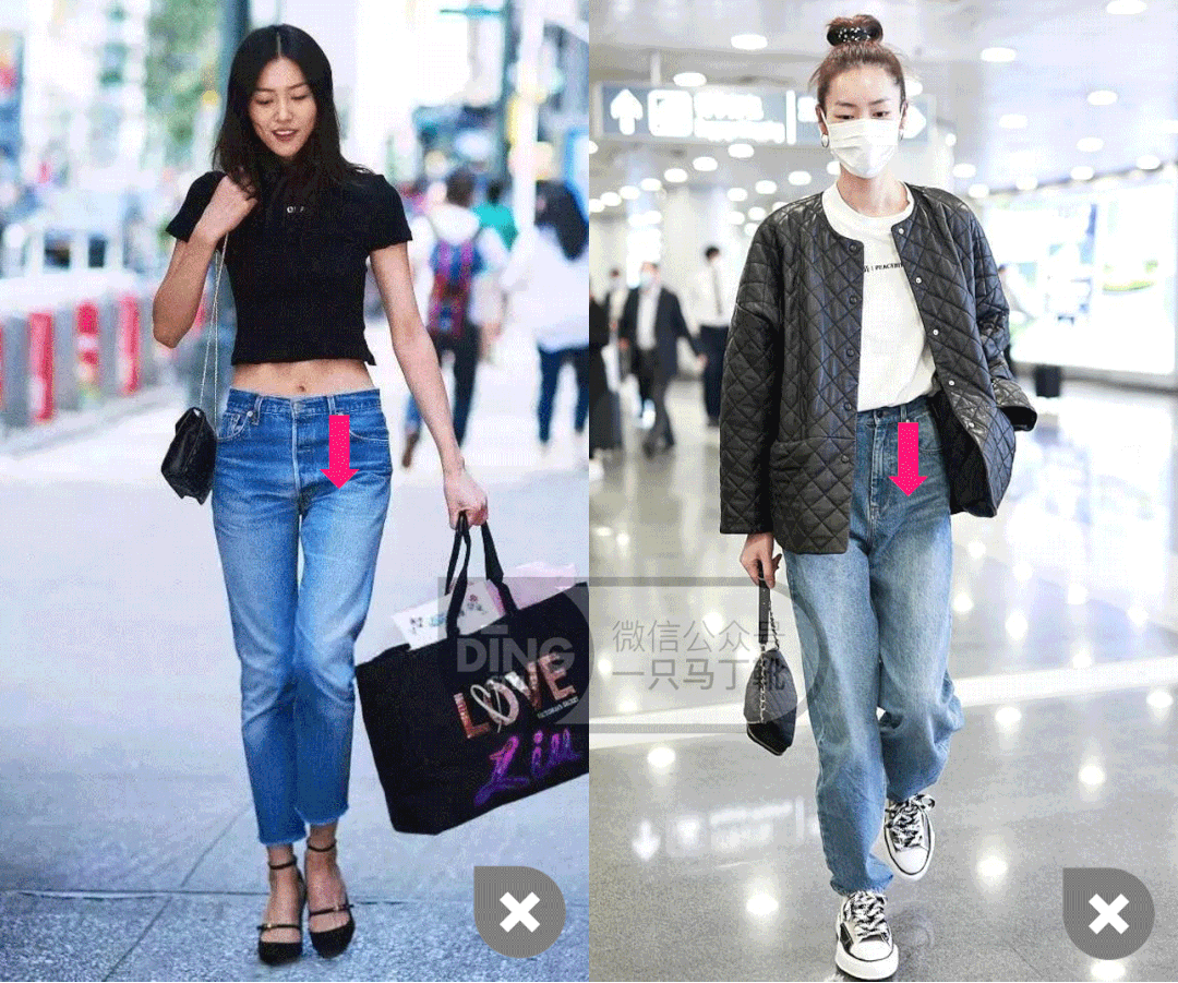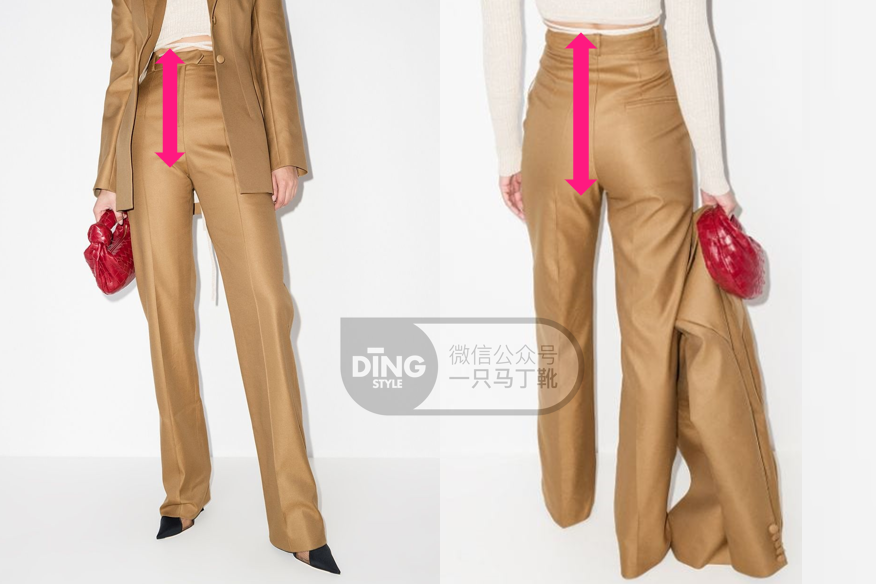 我们视觉上腰的长度就是腰线到裆部的距离,高腰裤虽然抬高了腰线,但裆位还是不变的。一味追求超高腰,只会让腰变得更长: