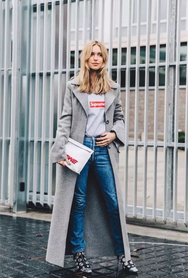 大衣+牛仔裤,增添休闲随性的的效果,