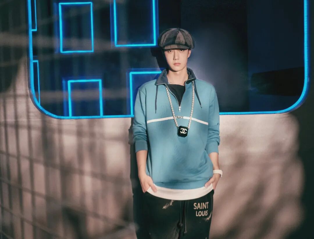 这件Palace的蓝色休闲卫衣搭配格纹英伦帽和珍珠项链,绅士funky范儿十足。特别是这只CHANEL airpods 耳机套珍珠项链可太值得疯狂种草~如此多不同风格的元素混搭在一起,还能这么和谐,不愧是你王一博。