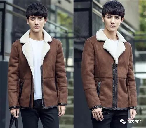 麂皮面料的外套非常特别,皮毛一体的外套带给你不一般的温暖感,小翻领的设计加羊羔毛的设计为男士增添了时髦的气息,拼皮的设计却又不失个性,下身搭配一条黑色的长裤,简约搭配很是帅气。