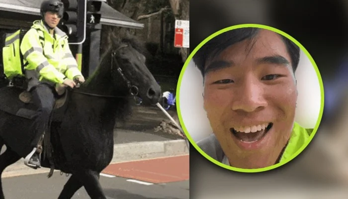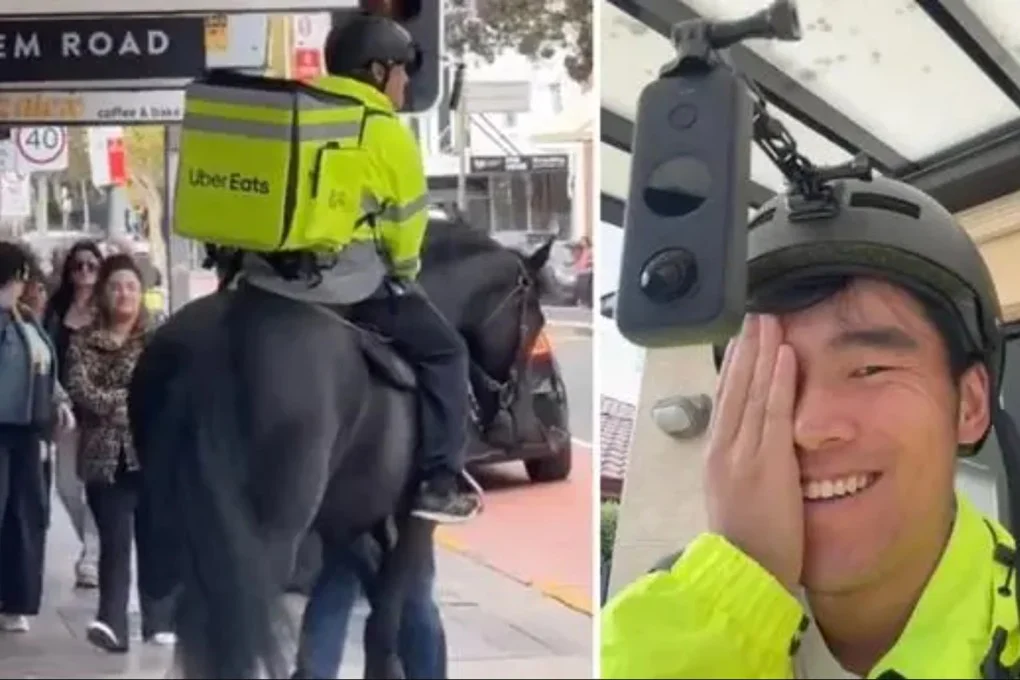 A short video of 23-year-old Stanley Chen wearing an Uber Eats jacket and carrying a delivery backpack as he rides a black horse through the streets of suburban eastern Sydney has gone viral online.
