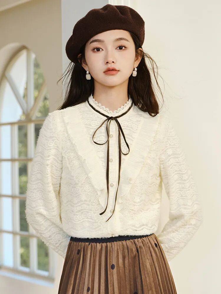 飘带元素也是非常适合聚会穿的,像这种飘带的衬衫非常抬人的气质,而且很有女人味,日常可以搭配一个开衫,增加保暖度,下面搭一条百褶裙就可以了。如果里面选择了亮色,外面选择灰调的大衣就可以了,女人味十足。