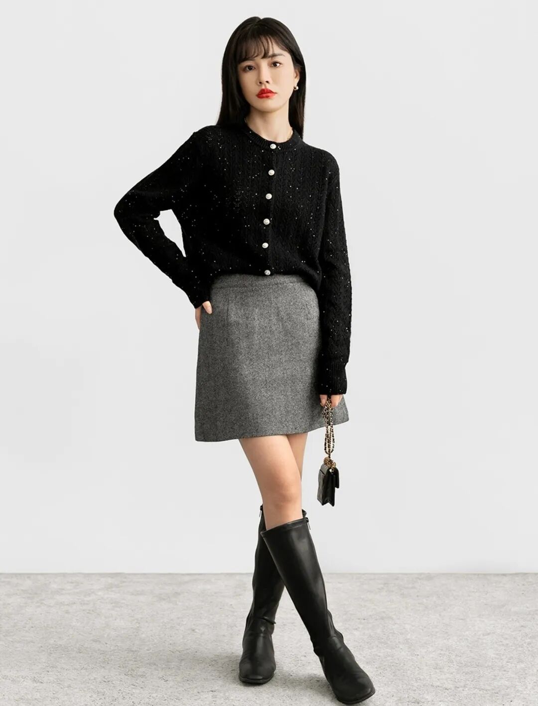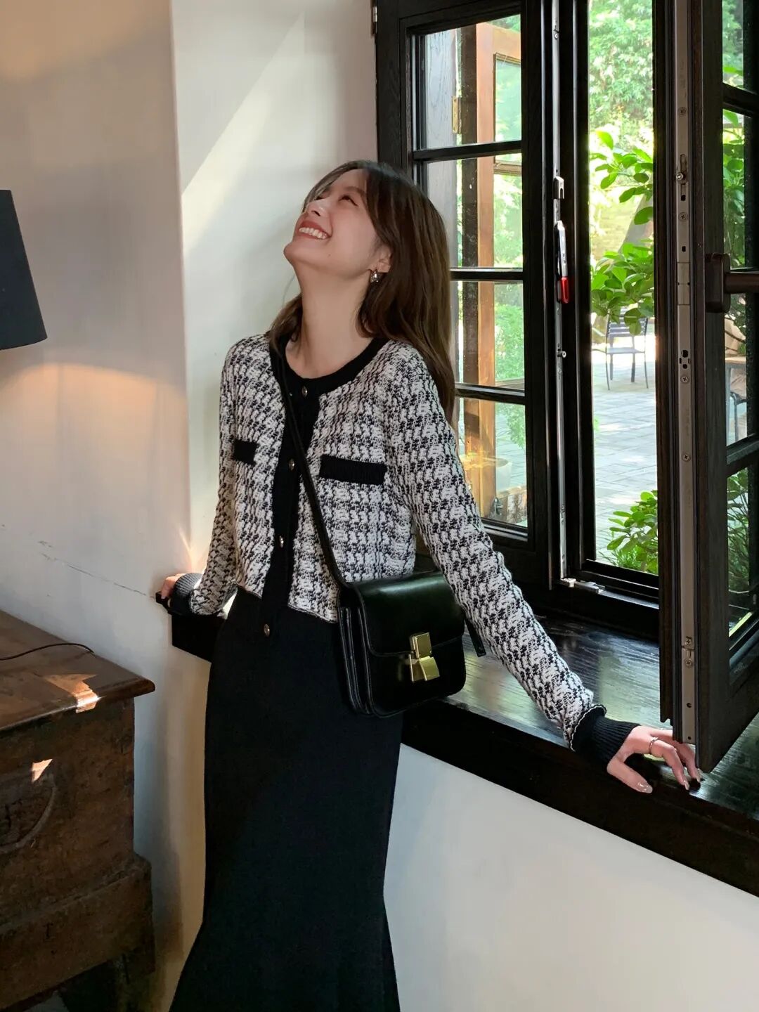 小香风的元素不可不错过,尤其这种经典的黑白色系小香毛衣,下面搭配灰色的半身裙,非常有氛围感,外套可以搭配一些粉嫩色的大衣或羽绒服,非常适合聚会穿,再戴一顶黑色贝蕾帽还有小香风包包,形成内外呼应,甜美又带有小香风的精致感。