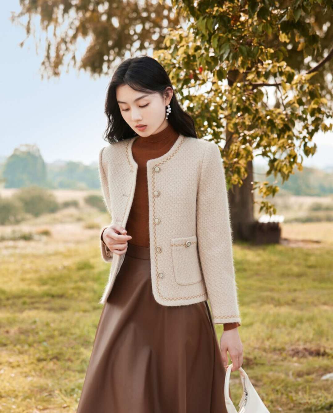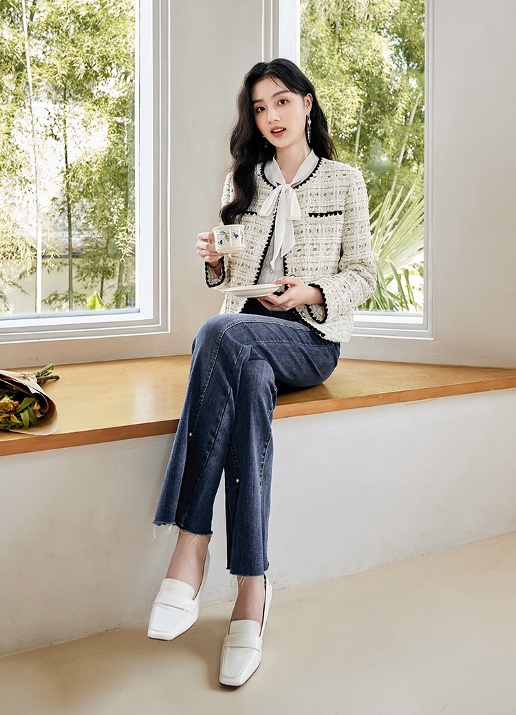 除了小香风毛衣,还有小香风风外套,尤其是这种白色的小香风外套,太适合聚会穿了。内搭还可以是飘带衬衫+牛仔裤,这一套贵气精致,适合比较重要的聚会场合。