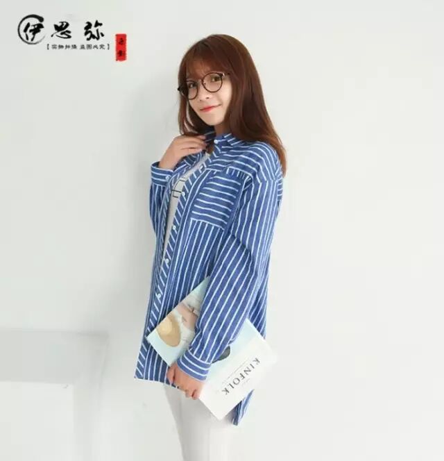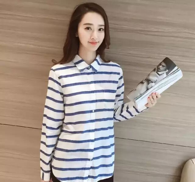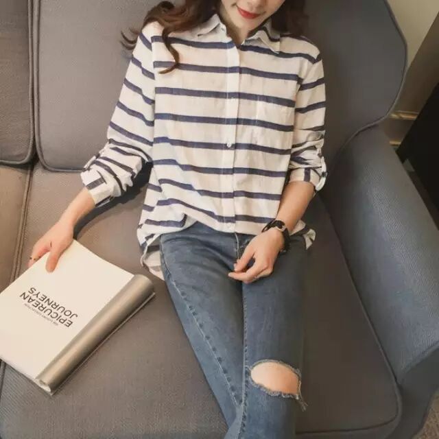 蓝白横条纹衬衫,搭配百搭的牛仔裤,是女孩们最爱的休闲打扮之一。