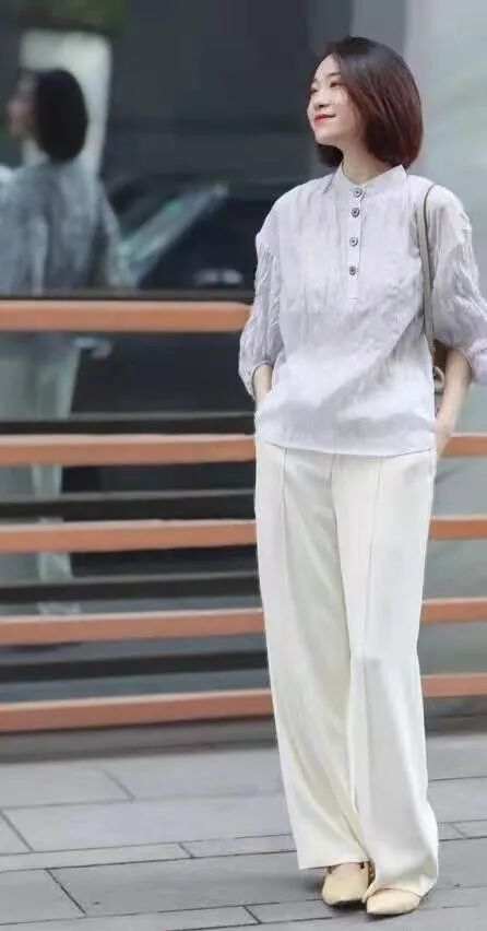 可以尝试一下这种圆领款式的衬衫,但前提是脖颈线条相对是较为优越的,会有一定的精致感,衬衫是带有褶皱的设计,看上去十分的高级,有一种田园风格,但是搭配的白色阔腿裤和尖头鞋,又呈现出了女人的气场,知性优雅又不单调。