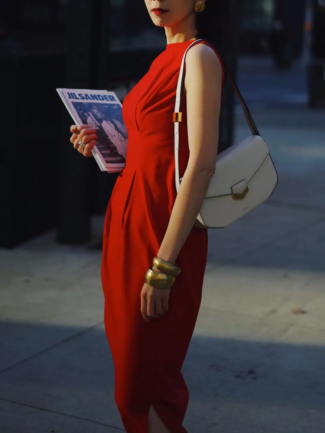 裙子是很正的红色,衬托肤色更显白皙,和金色饰品更是绝配,助理小姐姐说这一身去奥斯卡走红毯也不违和哈哈哈哈。