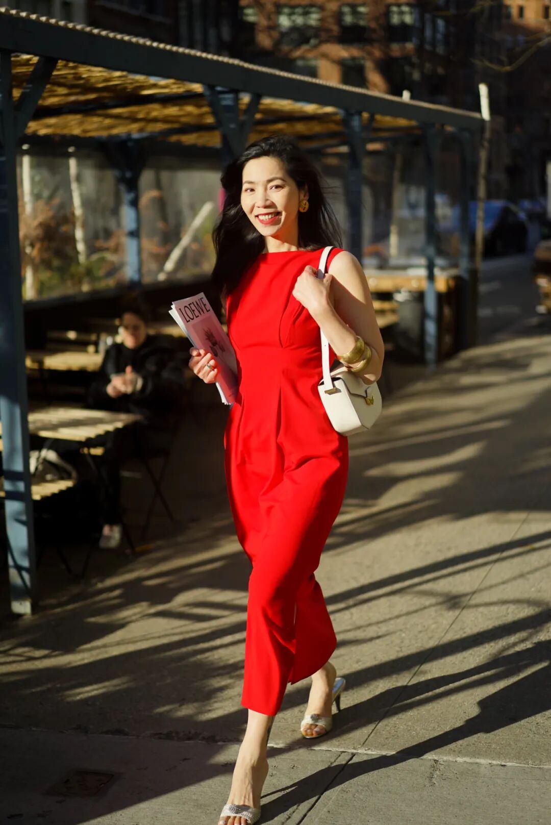 天气凉的时候外面可以加刚刚那件粉色西装,里外同色系穿搭,鞋子可以和包包呼应选择白色系,不需要任何技巧就能穿得很时髦。