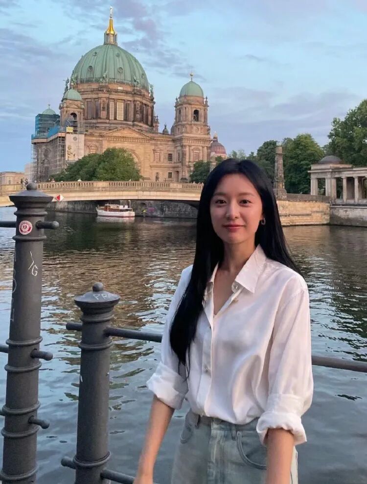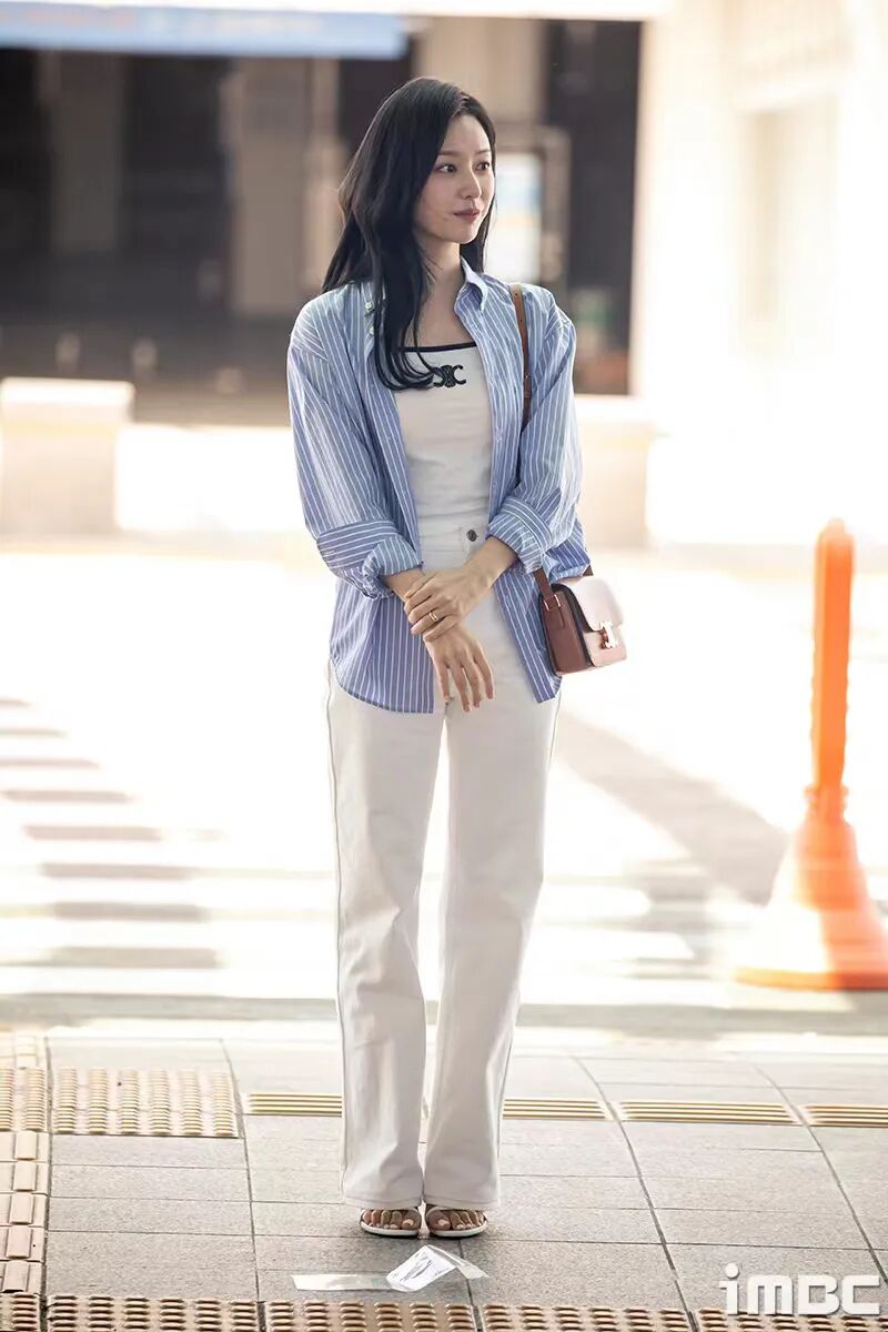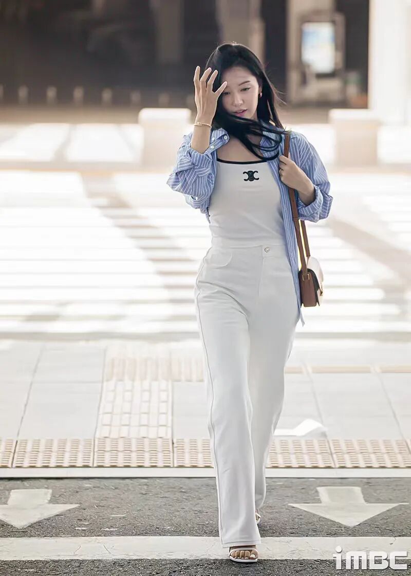 金智媛前天的机场照,相同的穿搭方式,只不过换成了蓝衬衫+白色仔裤,干净清爽的配色。▼