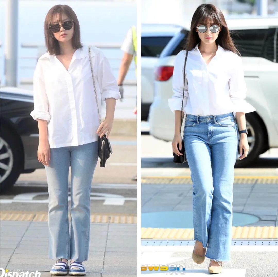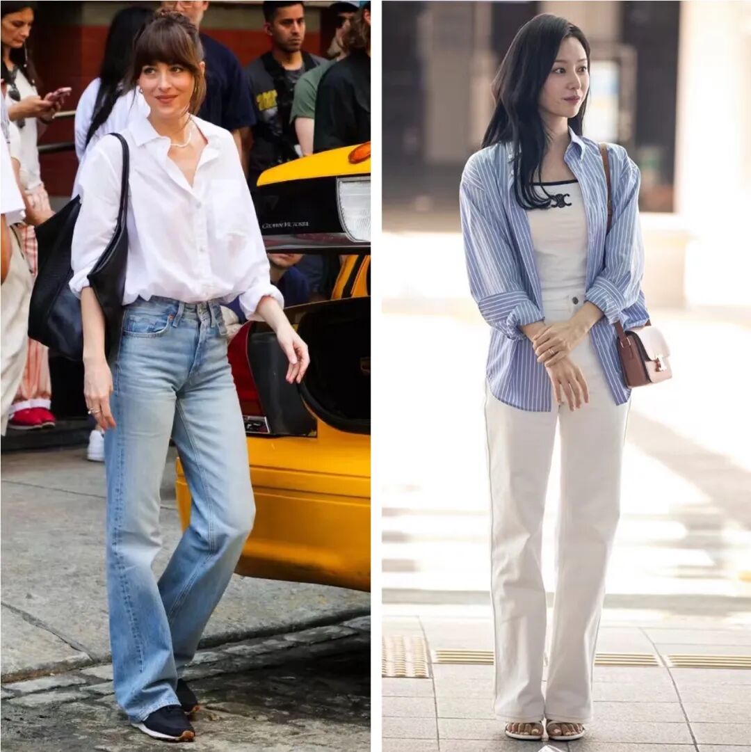 达妹和金智媛这两身的穿搭思路一样,微落肩衬衫搭配直筒裤。因为身高和气质的关系,达妹还是略胜一筹。▼