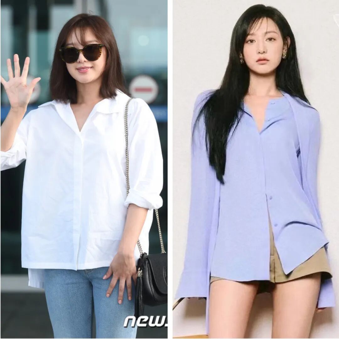 关晓彤个子高挑就是上半身有点厚,她穿挺括的衬衫也会让上半身变宽,如果选这种面料的衬衫,不如选右边的瘦长款,并把一侧撩起来露出腰带。▼