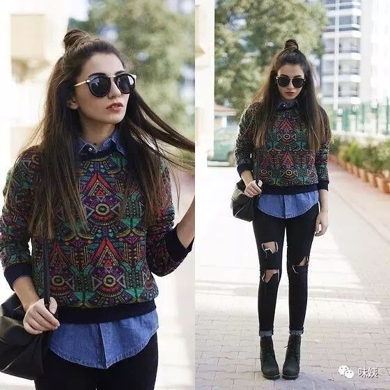 ▲花色毛衣最好搭配浅色牛仔,这样不会显得花毛衣太调档,而且穿起来也比较洋气。
