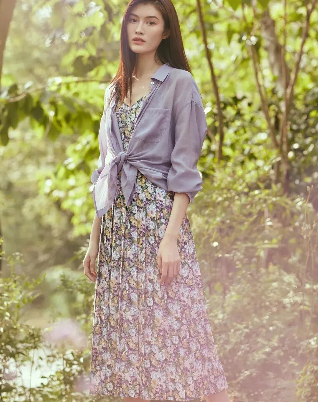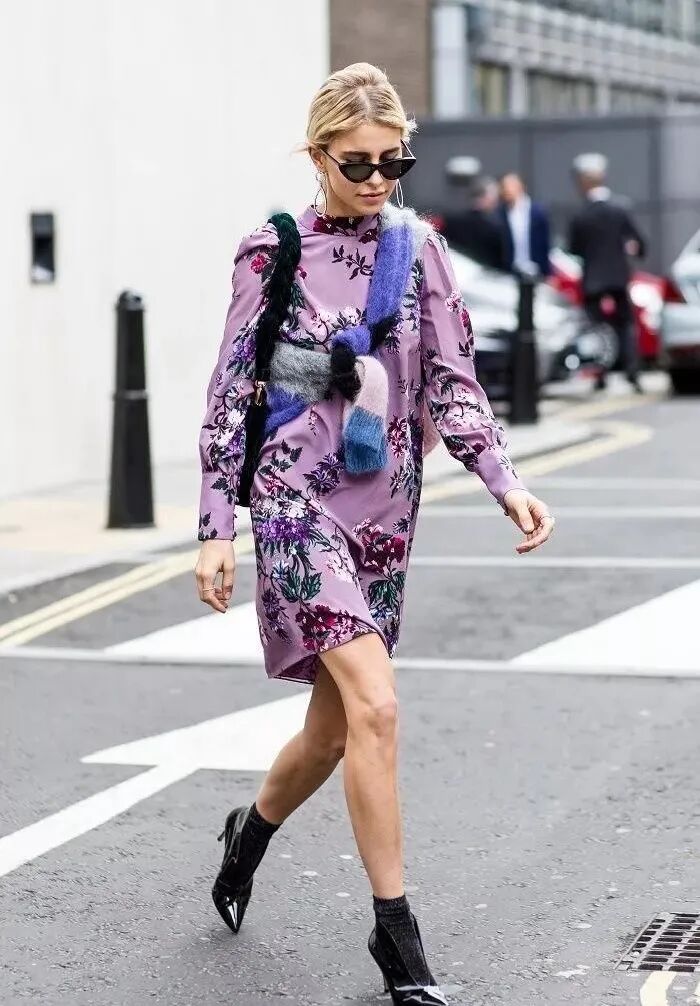 以淡紫色为底印花图案的裙装,这种田园复古风有的姑娘还是可以hold住的。