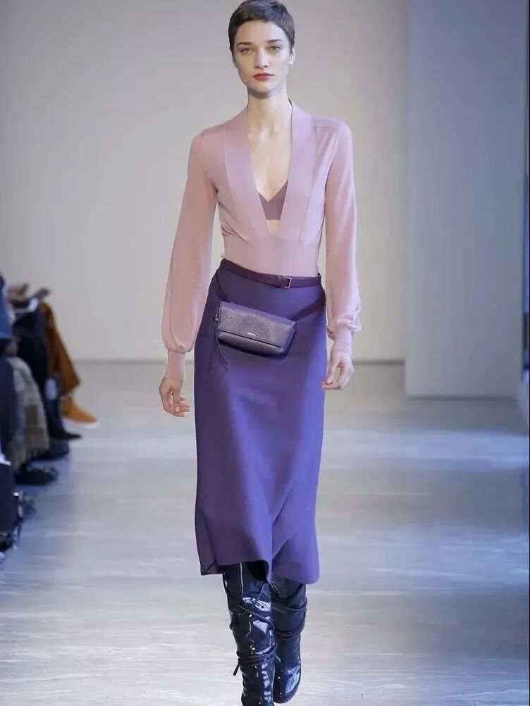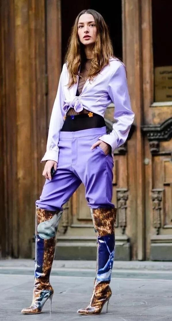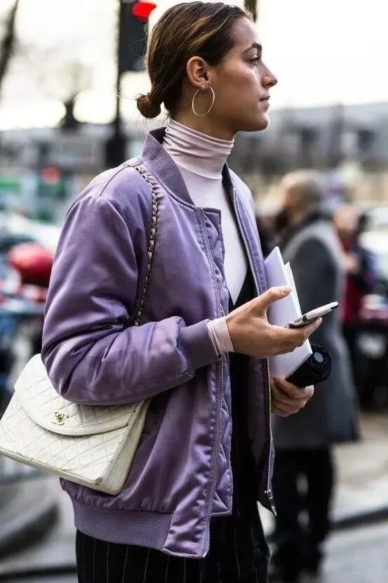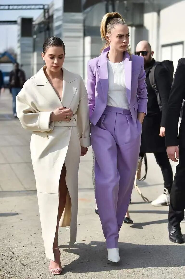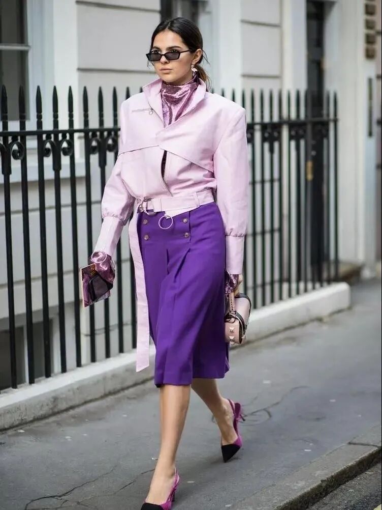 明度纯度不同的紫色服装尽可以大胆的搭,绝对让你气场全开!面料质感硬挺显得帅气,面料细软则尽显温柔。