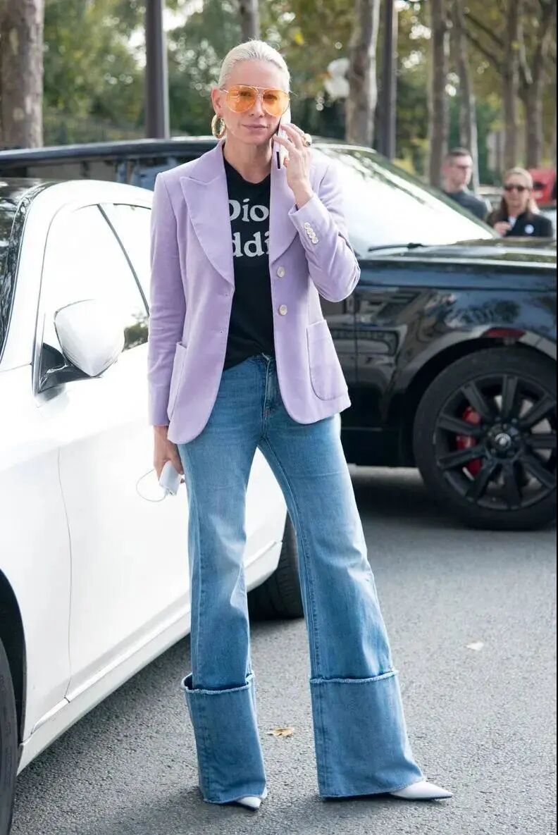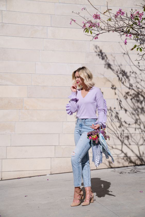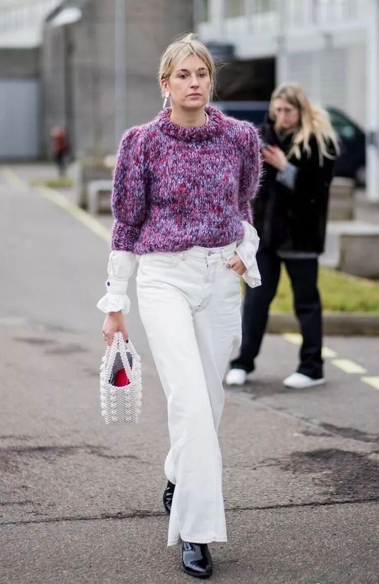 紫色上衣搭配牛仔裤也是不错的选择,好穿又不会出错,浅色牛仔裤清爽又不显臃肿。