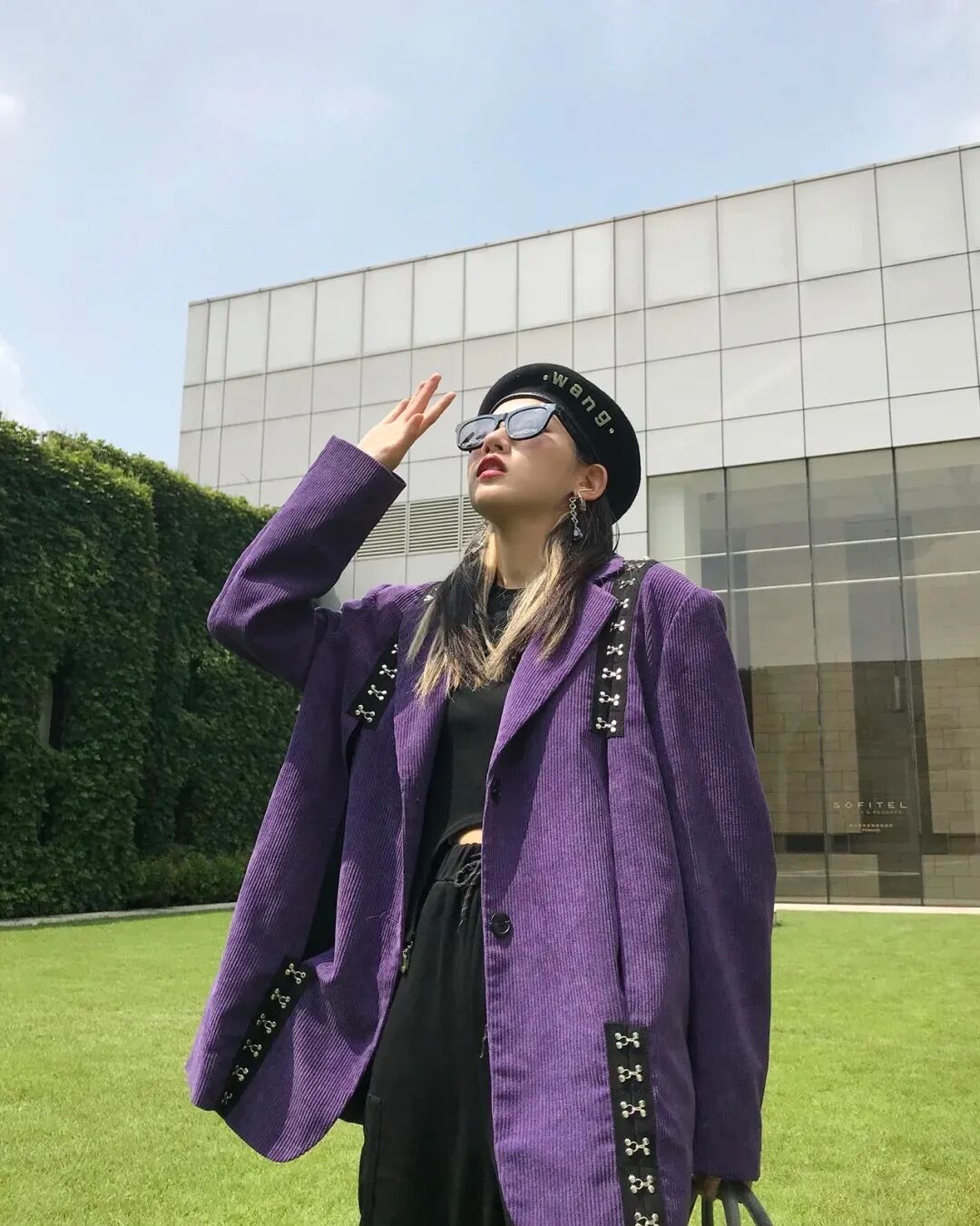 紫色外套搭配一件黑色打底,让紫色的浪漫也包含着甜酷范儿,酷女孩可以选择这种西装版型,十分有个性。