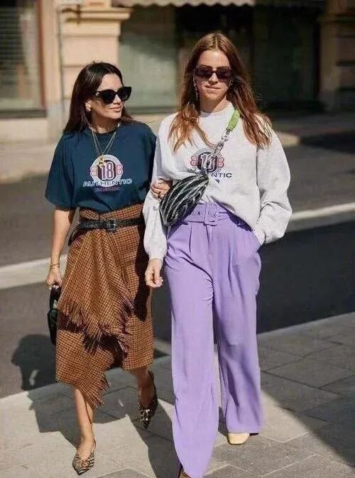 像这样饱和度不高的紫麻薯色上衣搭配蓝灰色半身裙,两者相呼应的紫色元素,夹杂着跳跃蓝色,再加上上衣侧边开衩设计,使得整体造型多了份活泼与灵动。这样的搭配在早春,也能给人一种清新不艳俗的感觉。