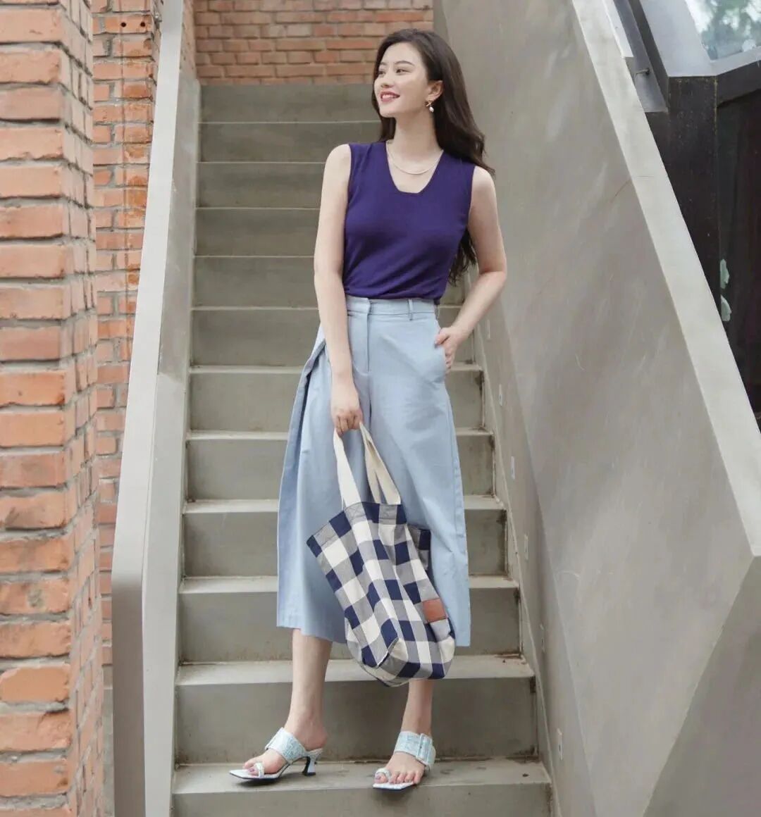 技巧3:搭配蓝色❂ 浪漫一夏紫色和蓝色都属于冷色系,适合夏天穿着。紫色砍袖衫搭配水蓝色牛仔七分阔腿裤,显得特别凉快轻盈。鞋子和包包都选了蓝白配,整体深深浅浅有层次感,色彩简单干净又有点小高级呢~