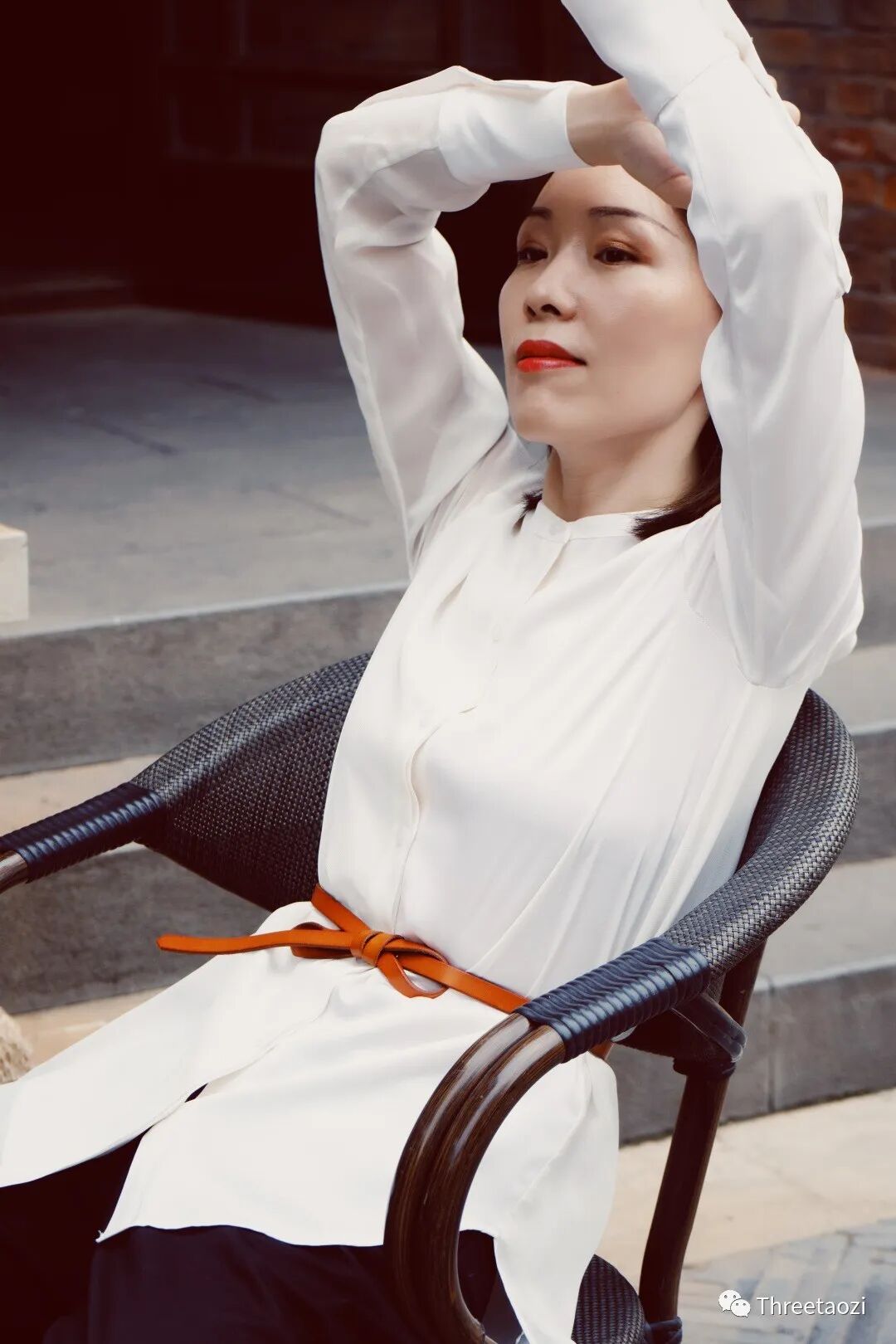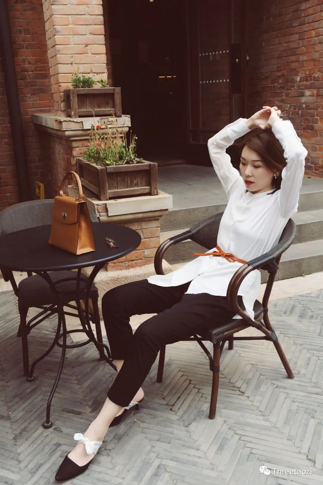 说完了黑+白,咱们来给职场加一点亮色。桃子很喜欢在穿搭里加亮色,因为即使是职场,也需要适时的用亮色来点缀 。搭配思路上衣——这身look里裤子没换,我只换了上衣和鞋子。上衣换成了蓝色圆领衬衣,在所有的领型里,圆领最可爱。而且它还做了喇叭袖口,不像普通职场衬衣那么严肃。加上材质是真丝,比较柔软,所以是不是没那么强势?!不穿西装时,我穿什么?